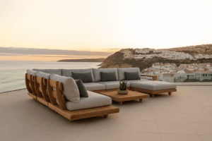 The deep, plush cushions in neutral grey tones are upholstered in weather-resistant fabric, providing ultimate relaxation while maintaining a sleek, contemporary aesthetic. The set includes a spacious L-shaped sofa with generous seating and a matching teak coffee table, perfect for gatherings, lounging, or sunset views.